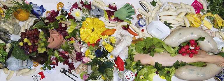 Blum schichtet darin jetzt Ebenen ihres Gesamtwerkes auf- und ineinander bis neue seltsam-surreale Erzählungen entstehen. Fast wie bei einer „Nose to Tail“-Verwertung im Fleischerhandwerk und inspiriert von der Sammlungspräsentation im Fleischermuseum, zerlegt* sie alles in Einzelteile, sortiert Fragmente und Geschichten, nimmt weg, kombiniert neu und führt so vieles ad absurdum. Es entsteht eine installative Landschaft, welche die Grenze zwischen Fiktion und Realität verwischt, etwas über die Seele der Künstlerin und ihr Werk erzählt und dem Ganzen am Ende noch ein makaber bis blutiges Extrakapitel obendrauf setzt.