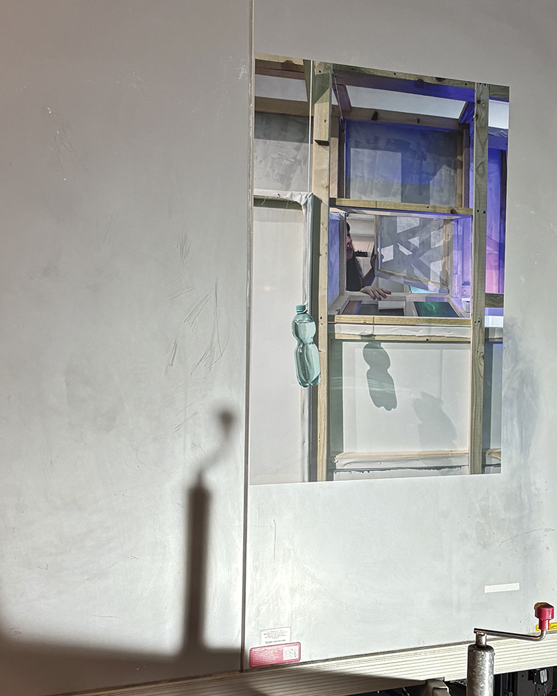 Im Saal des Kunsthauses entsteht teilweise live vor Publikum eine raumgreifende Installation, die konstant im Wandel zu sein scheint. Das Zentrum bildet ein küchenähnlicher Raum, der als Sinnbild des zentralen Ortes jeder Behausung für gemeinsamen Speisen, Sprechen und Austausch steht. Die Installation ist mit verschiedenen Funktionen versehen und wirkt gleichzeitig dysfunktional, fragmentiert. Wände sind nicht fest verankert und scheinbar massive Elemente sind leicht und beweglich. Anknüpfend an den Gedanken der Heimatstube präsentiert sich ein surrealistisches Setting zwischen Diorama, Spielfeld und Filmset. Eine Kulisse, die zum Verweilen einlädt, ein Zufluchtsort, ein geschützter Raum. Nur wer schützt sich hier vor was oder vor wem? Ist man einmal drin, so darf man gerne länger bleiben, manchmal gibt es Kuchen, Suppe oder Gesprächspartner*innen, manchmal gibt es nichts. Die Szenerie scheint verlassen und gleichzeitig in Erwartung der nächsten Veränderung.